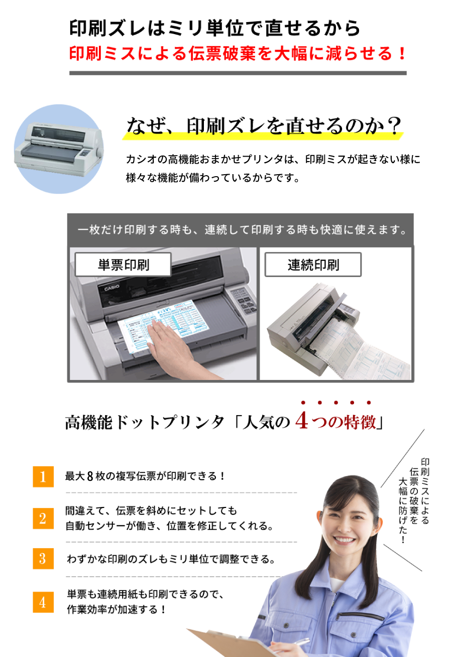 チェーンストア伝票などの複写伝票は、カシオのおまかせプリンタで快適に印刷できます。最大8枚複写用紙に対応しています。単票(1枚)でも連続した伝票でも印刷できるので便利です。複写伝票の印刷はズレると印刷し直すこともあり、伝票用紙のロスに繋がりますが、カシオのおまかせプリンタには自動で位置合わせを行い、印字ズレも簡単に調整できるので、ロス削減に繋がります。