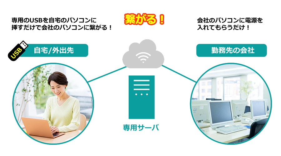 例えば、テレワークをする場合、社内にいる誰かにパソコンの電源を入れてもらうだけで、