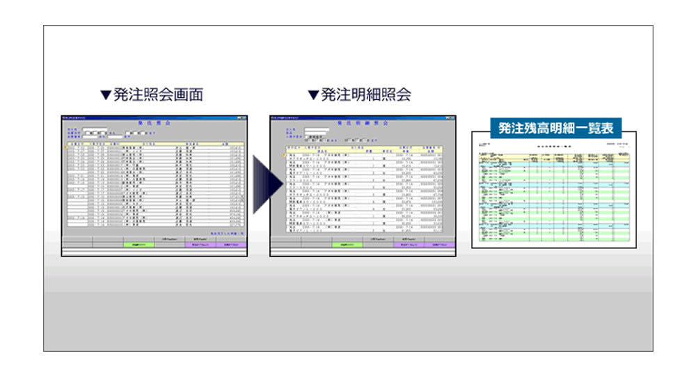 発注残数量は、発注したが未だ仕入されていない(入荷していない)状態の数量を表します。その発注残情報を仕入別や入荷予定日別に画面に表示することが出来ます(発注照会画面)。また、入荷予定日別の一覧表を印刷することも可能です。これで、正確な発注管理が可能となります。