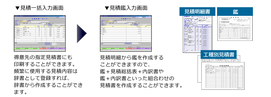 見積書をそのまま表示 | 固定画面での入力のほかに、パソコン画面に今使用している見積書のイメージを表示し、入力することが可能です。出力では、複写式見積書や指定見積書などご希望の書式に合わせて印刷することができます。 |