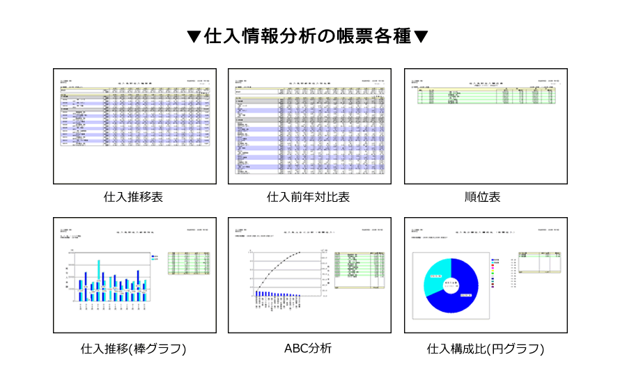 仕入入力データをもとに、仕入先・商品・担当者別に帳表を出力できます。帳票は、推移表、前年対比、順位表。グラフは推移、前年対比、構成比、ABC分析の種類があります。集計は月単位で集計され、印刷条件で、月間、年間の指定ができます。(推移表、前年対比は年単位)