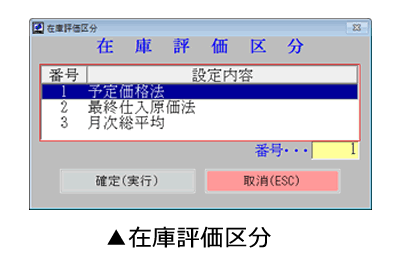 在庫の評価方法は商品ごとに「予定価格法」、「最終仕入原価法」「月次総平均」の3種類をご用意。取扱い商品にマッチした運用が可能です。在庫管理システムの在庫評価区分画面