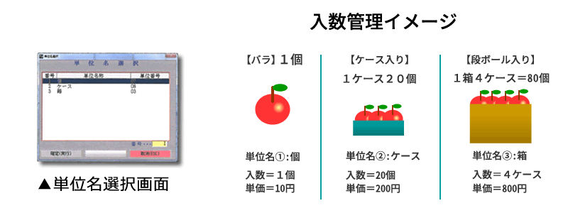 在庫管理で3種類の単位が選べます。商品マスタに3種類の単位を用意しているので、各単位ごとに入数と単価の登録が可能です。伝票入力時は商品の出荷形態ごとに単位を選択できます。また、前回単価も単位に合わせて3種類の登録ができます。