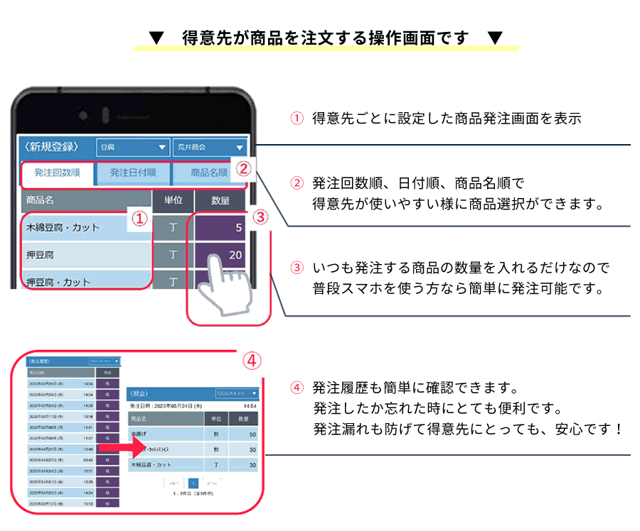 スマートフォンの注文入力はシンプルで簡単です!IT機器の操作が苦手な得意先でも安心して使えます。