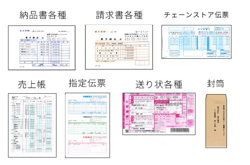 市販のコクヨ伝票やチェーンストア伝票など様々な形式の伝票に合せたプログラムを作成いたします。現在、使用している自社伝票や得意先の指定伝票もそのまま使えるようになります。