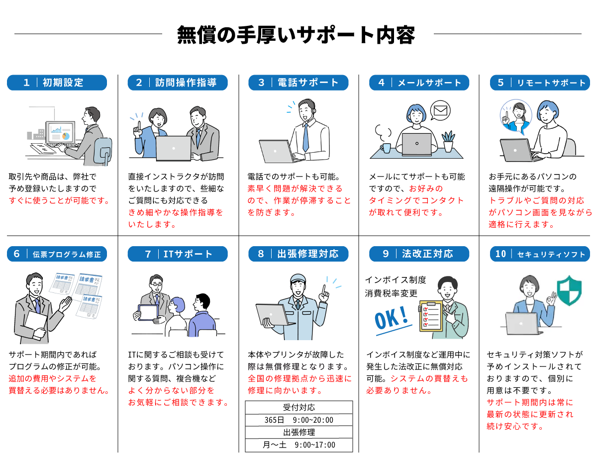 時間と手間のかかる初期設定は弊社で行います。(無料です)得意先の登録や商品登録も合わせて行いますので、導入後はすぐに使い始められる様になります。